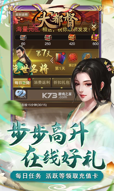 《大都督》是一款养成类的手游,上线登录即可领取海量福利,助力玩家轻松开局,在游戏中玩家需要扩大自己的势力,不断的招兵买马,培养武将,体验官僚上的尔虞我诈,喜欢的小伙伴快来下载体验一番吧!