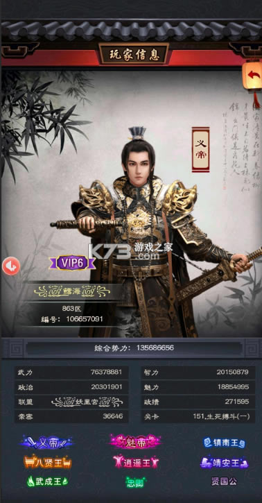 势力是门客和孩子的属性综合,母亲的亲密度会影响子嗣属性,属性对应科举之后的级别,0-999 童生,1000-2999 秀才,3000-4999 举人,5000-9999进士,1W-14999 探花,1W5000-19999 榜眼,2W以上 是状元。子嗣嫁娶的时候一定要斟酌斟酌再斟酌。毕竟对平民玩家来说,元宝花掉真的心好痛。所以像任务给的那些连理枝之类的,推荐留给举人等花的多的,毕竟嫁个童生才80元宝,跟举人比真的便宜好多,而且完成限时奖励里面的联姻次数还会送道具。