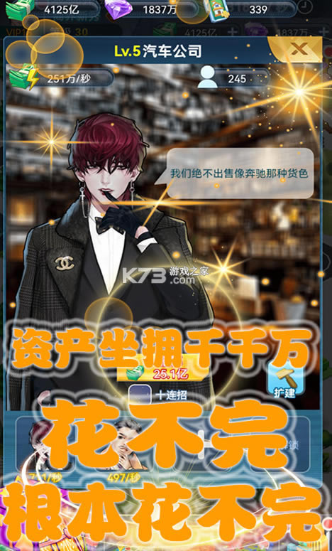 不断积累财富,玩家在游戏里面成为总裁角色和身份,游戏操作简单,拥有完美投资经营题材的商业游戏,开局玩家就是一位总裁,拥有自己的公司,体验豪车,可以开设店铺,享受极致生活,打造自己的商业帝国,游艇,利用一切手段赚取大量的财富,一步步建立自己的商业总裁总裁帝国,投资更多的产业,打造自己的商业帝国。