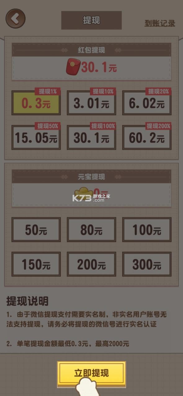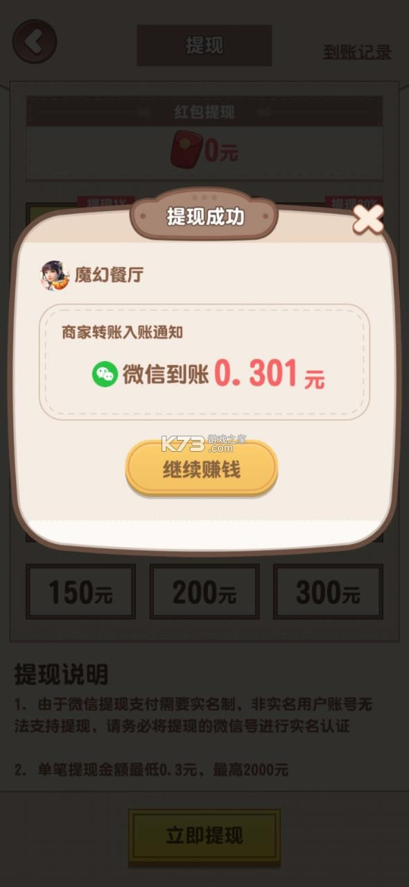 魔幻餐厅红包版采取的是奖励双提现渠道模式,第一个红包提现,提现0.3元按照新手等级如果大家获取到30元红包就可以直接申请。第二个是元宝提现,需要最低满50元才能申请提取奖励。