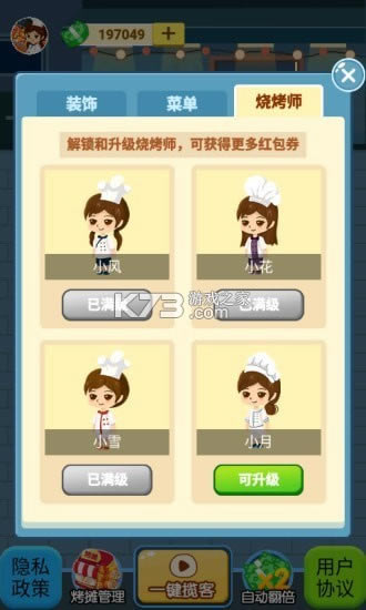 c、还有非常多的烧烤种类可以解锁,如果玩家等级越高,解锁的数量也是越多,收益也会越高。