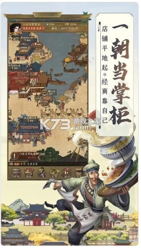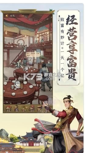 搭载精美水墨画面和厚涂风格人物,带你梦回古代。 游戏中,玩家作为一个新手掌柜来到汴梁打拼,结识各位奇人,并将其招为门客,合力经营买卖;邂逅红颜知己,相知相遇,一起白手起家;通过拼搏与努力,最终成为一个独当一面、富甲一方的商人。
