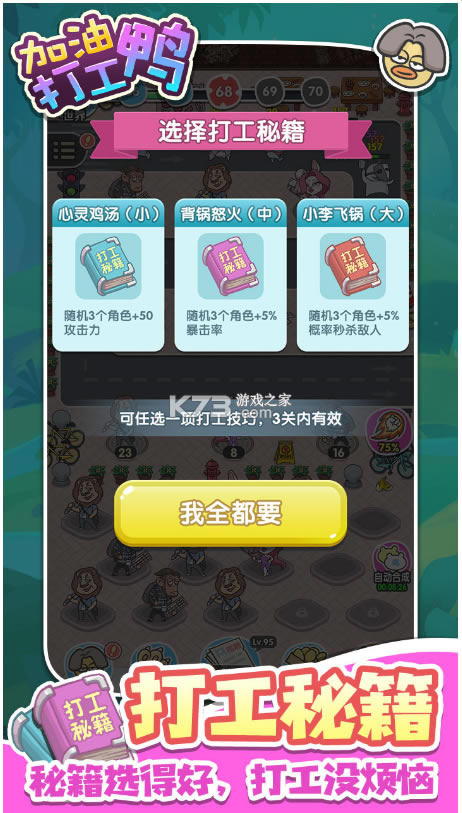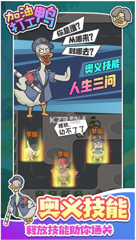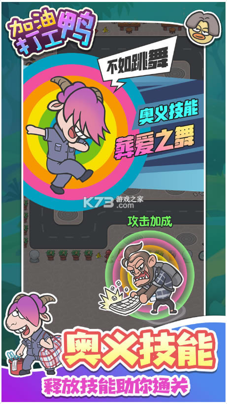 《加油打工鸭》是一款人物造型非常魔性的模拟闯关手游,游戏中玩家需要通过放置的方式来保护自己的家园,同时游戏为玩家们设计了各种各样的搞鬼的人物外形来帮助玩家进行防守,但最重要的还是需要根据怪物的弱点进行合理的搭配才能更加轻松的通关关卡。
