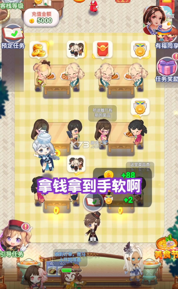 开心客栈红包版是一款经营客栈的养成游戏,玩家可以通过升级厨娘来增加做菜速度,一键揽客来获取超多客人,招待客人获取金币,享受经营客栈的乐趣。