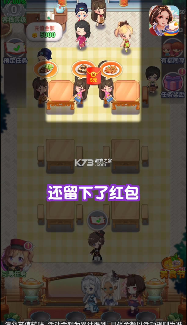《开心客栈红包版》非常好玩的一款餐厅经营赚钱游戏,玩家将会化身为客栈的老板,自由的对客栈进行设计装饰,把客栈打造的独一无二,招募更多的员工将客栈不断的壮大,招待的客人越多拿到的红包越多。