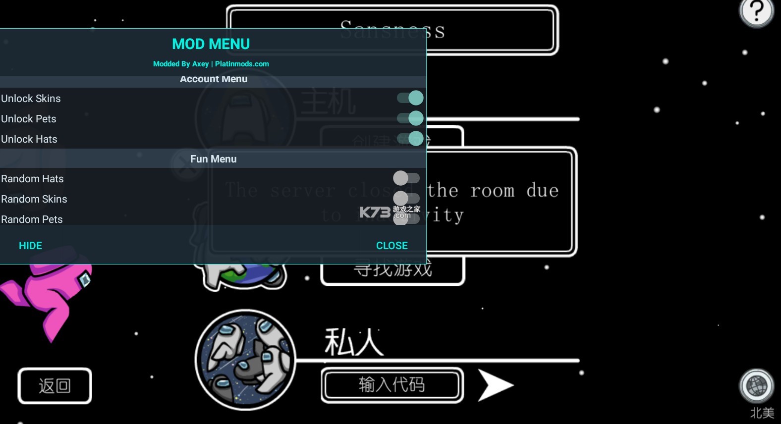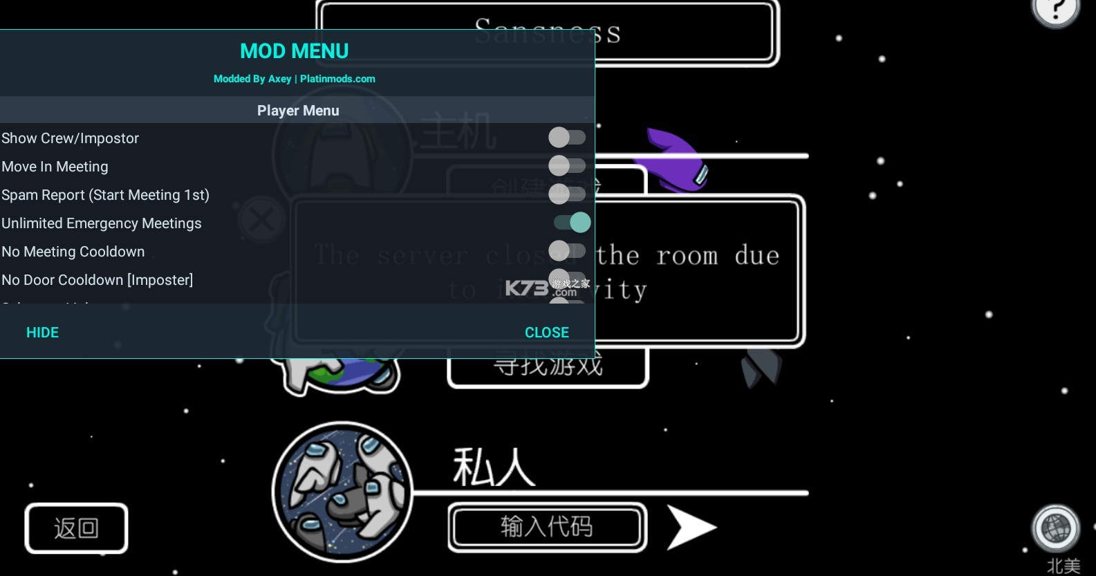 《太空狼人杀汉化版内置修改器》提供了中文的修改功能了,中文无限金币版本提供,大家可以尽情的当内鬼或者当船员了,这个版本里面玩家们还可以选择自己的身份阵营,绝对逆天的破解版本,不信来看看。