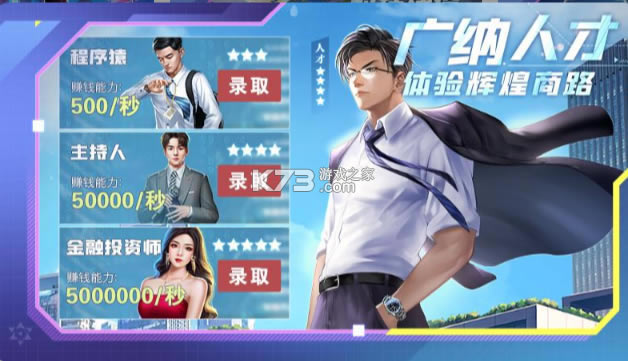 玩家可以通过投资、商战、金融战争、宴会等玩法,获得提升人才能力和建筑等级的道具,在竞争激烈的商业环境下,对抗金融巨头,打造自己的商业帝国。通过游戏,玩家能获得经营策略思维、人才团队培养思维的锻炼,体验创业的乐趣,感受商战对抗的紧张激烈和波谲云诡。