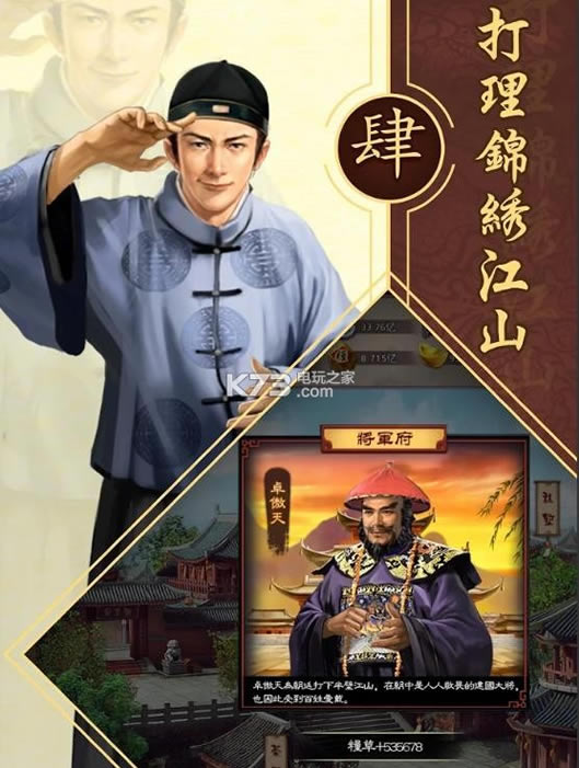 《官场风云王的逆袭之路》官场的官员如云,超多的武将来加入,包含了很多的游戏系统,不断的升级提升属性,迎娶分红佳人,各路门客前来求见,满足要求。