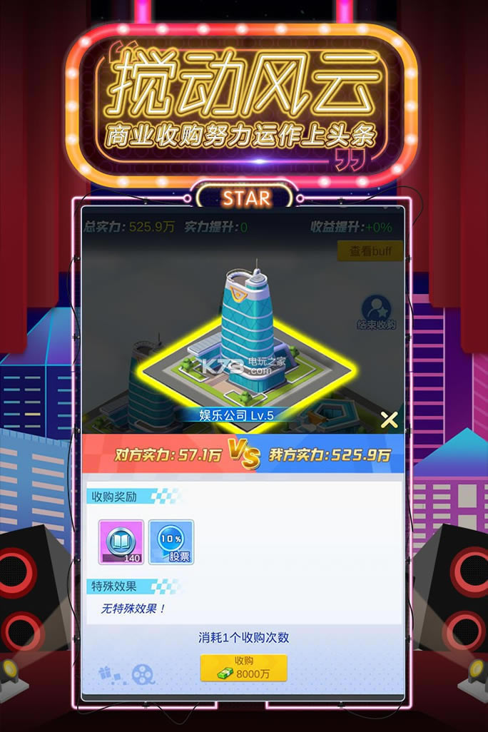 在游戏内,玩家可以签约其他艺人,拍摄属于自己的电影,获得丰厚的票房收益;提高知名度,从一个普通素人成长为国际巨星;策略性的安排自己的艺人出演不同的电影,为艺人的定制培养路线,打造一个全明星工场。