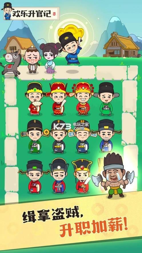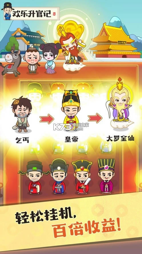 轻松简单易上手的休闲类小游戏。升官、巡视就能得到俸禄,俸禄能培养更多的官员,提升官位;从小老百姓升级为玉皇大帝,从此走上“仙界”巅峰!