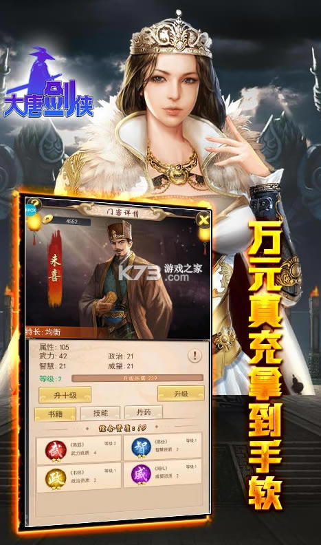 《大唐剑侠-零氪无限充》是一款创新的经营养成官斗手游,游戏以当官第一视觉生动呈现,游历寻访、历史关卡、培养门客、衙门辩论 、酒宴社交等精彩玩法,提升个人实力,成为朝廷重臣,为国效力。通过游戏,能够让玩家在网络上展示自己的多面性,同时也能够培养玩家对国家大事的关注度。