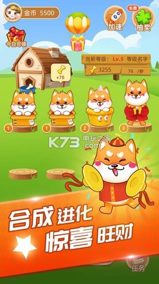 《家有旺财》通过低等级的狗狗进行合成来获得更多的金币收益,家有旺财金币版最终可以合成神犬旺财,让你的金币源源不断的,并且达到目标就能兑换现金了哦,来认领你的旺财吧。