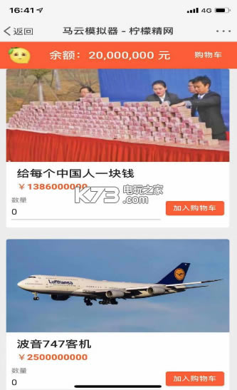 打开《马云模拟器》之后,你将“拥有”279,000,000,000 元。用这些钱,你可以买1116000000杯奶茶、9300000000斤猪肉、217968758张周杰伦演唱会门票、39857 辆兰博基尼、2536 座欧洲海岛、 111架波音 747 客机等。如果你什么都不买,把钱存进余额宝,你会发现你的账户每秒钟就有 200 元收益。