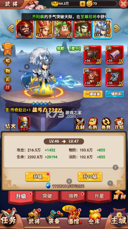 ★升级送抽奖券,免费抽极品武将,也可兑换顶级金将!