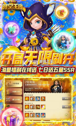 《时空王座》上线就送一百抽,登录就送6元券,攻略城池一马当先,回味经典的中土战争,闯关就送红包,高额返利疯狂抽英雄,尽情的狂飙,领取更多的稀缺资源,海量福利在线送,七日就送五星SSR,闯关必得红包。
