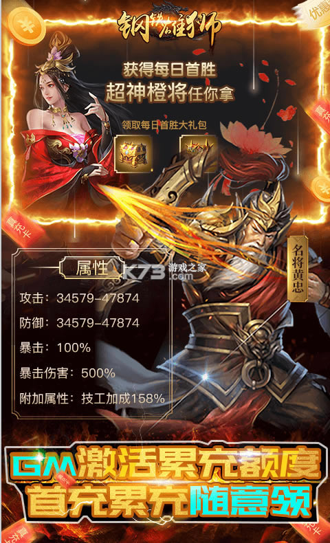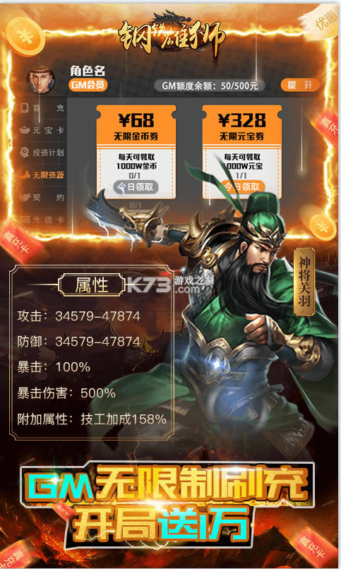 进阶礼包:GM点*50、普通橙将自选箱*1、强化石*100、升星石*100