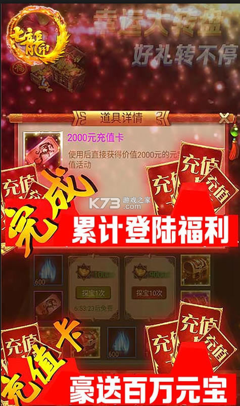 《七龙印》上线就送svip,领百万元宝,抽2千充值卡,送抽奖券,任意抽福利超级多,七日登录就送诸葛亮让你制霸三国世界,三国鼎立让游戏变的与众不同,不在拘泥于传统,玩家们自由的掌握节奏,开启全新的三国时期的争霸。