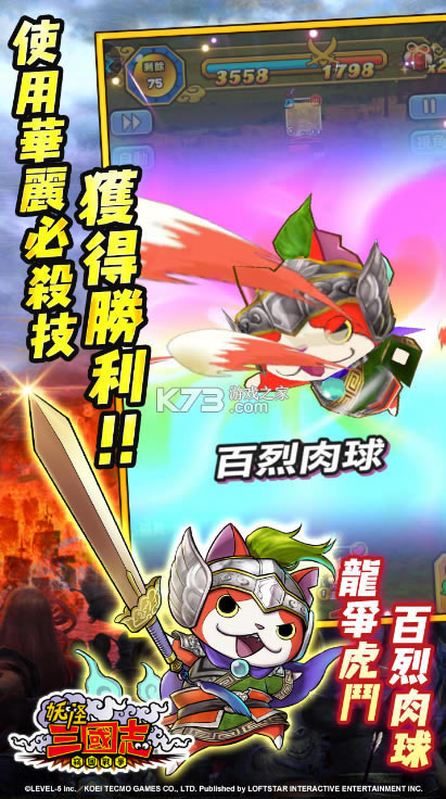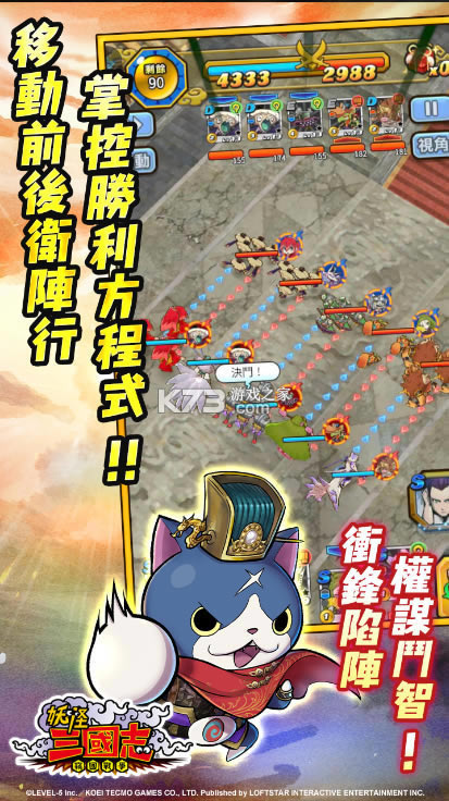 妖怪三国志国盗战争是《妖怪手表》系列最新手机游戏。妖怪三国志手游类型为战略角色扮演,由变成三国武将的妖怪们,也就是「武将妖怪」率领大军进行各种大战。在战斗中除了可以使用附身和妖术等技能以外,《妖怪手表》系列作特有的「必杀技」当然也不会少。你要做的就是看准战况捉住时机施展「必杀技」!