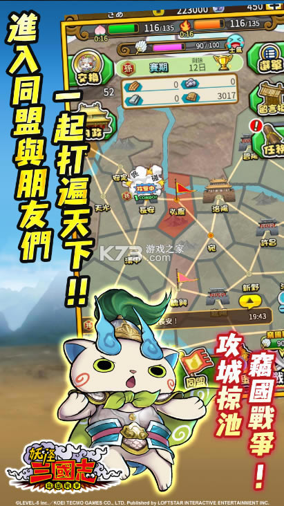《妖怪三国志窃国战争》是一款Q版RPG策略手游,该游戏以光荣旗下三国题材策略游戏《三国志》与LEVEL-5《妖怪手表》为蓝本,将妖怪们化身为三国武将,玩家将率领这些妖怪大军,与敌人展开对战,在三种势力中进行选择,与其他两股势力进行角逐。