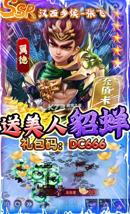 4.上线即送三重好礼,“绝色貂蝉”礼包码:DC666,“战神吕布”礼包码:FX666,“张辽极品魂器”礼包码:ZL666