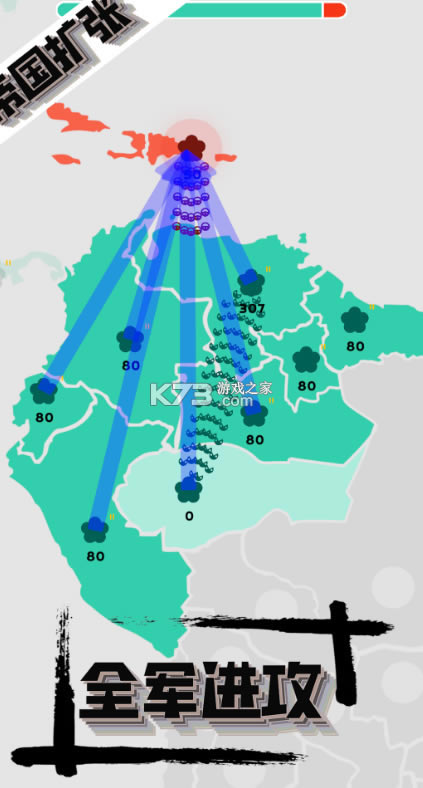 《帝国扩张》是一款即时OA战略游戏,玩家通过合理的派遣兵力,进行领地守护及攻占,最终击败敌人占领全图,取得胜利。游戏之初,玩家会有少数已占领的领地,可以源源不断的生产出士兵,通过积攒士兵以及对地方操作的判断,在保住自己已占领的领地的情况下,合理出兵进行攻占敌方领地。开动大脑,为了帝国扩张而战,将属于你的颜色铺满整个地图!