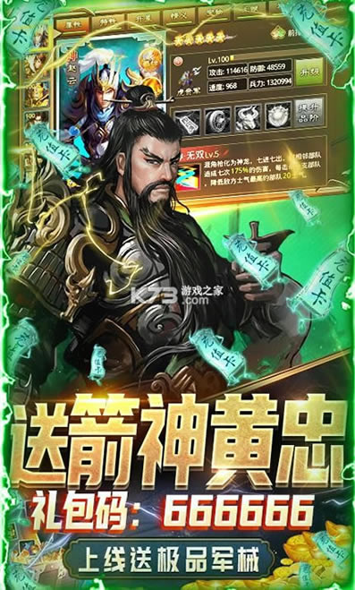 ★上线即送三重豪礼,“箭神黄忠”礼包码:666666,“洛神甄姬”礼包码:888888,“绝世美人”礼包码:999999