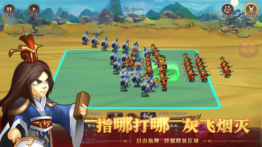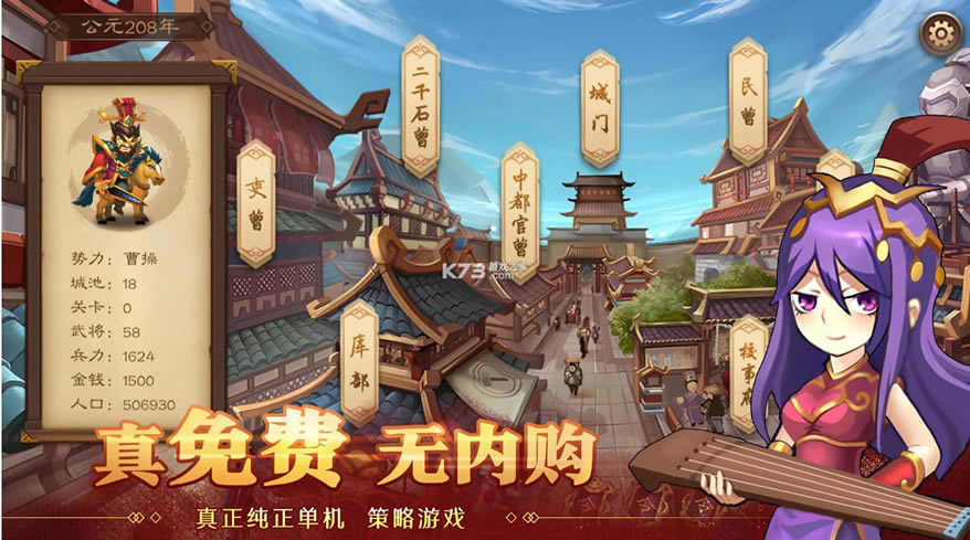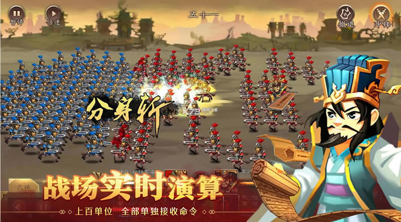 这是一款纯免费,无内购的策略即时作战单机游戏,以经典的三国为世界观背景,游戏中玩家化身一方主动,带领曹操,周瑜,诸葛亮等熟悉的角色,在这里开启属于你的征战史诗,书写你的战场故事,给你真正的指点江山的快感,并且游戏真正免费,让你体验真实的三国之战。