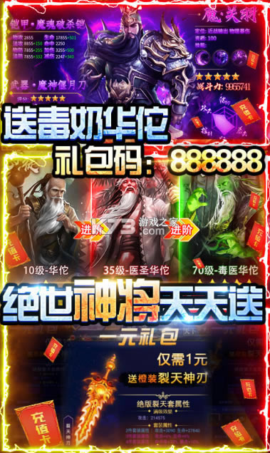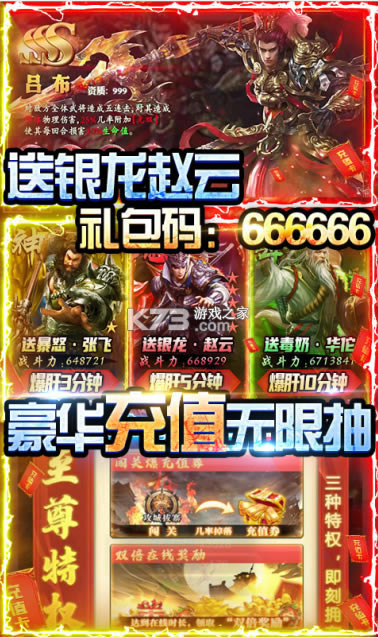 ★上线即送三重豪礼,送银龙赵云!礼包码:666666!送毒奶华佗!礼包码:888888!送绝世神装!礼包码:999999