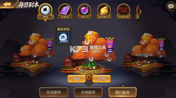 每日副本有多种不同类型的副本,每个类型的副本会在不同的日期开启,产出不同的固定资源,铜钱、经验书、进阶丹、宝物进阶石、经验配饰、装备精炼石、配饰精炼石。副本同样有难度区分,不同的难度根据自己的战力,能够获取的奖励也不同,只有完全击败守军且到达对应的等级,才会开启新的难度。