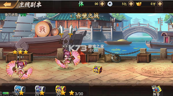每个章节有十关,只有击败了当前关卡才能挑战下一个关卡,每个关卡根据你的战斗情况会进行星级评分,最高评分为三星。集齐一定的星星就可以开启宝箱,获得丰富的元宝、金钱和物品奖励。通过至一定的关卡数会开启新的场景。