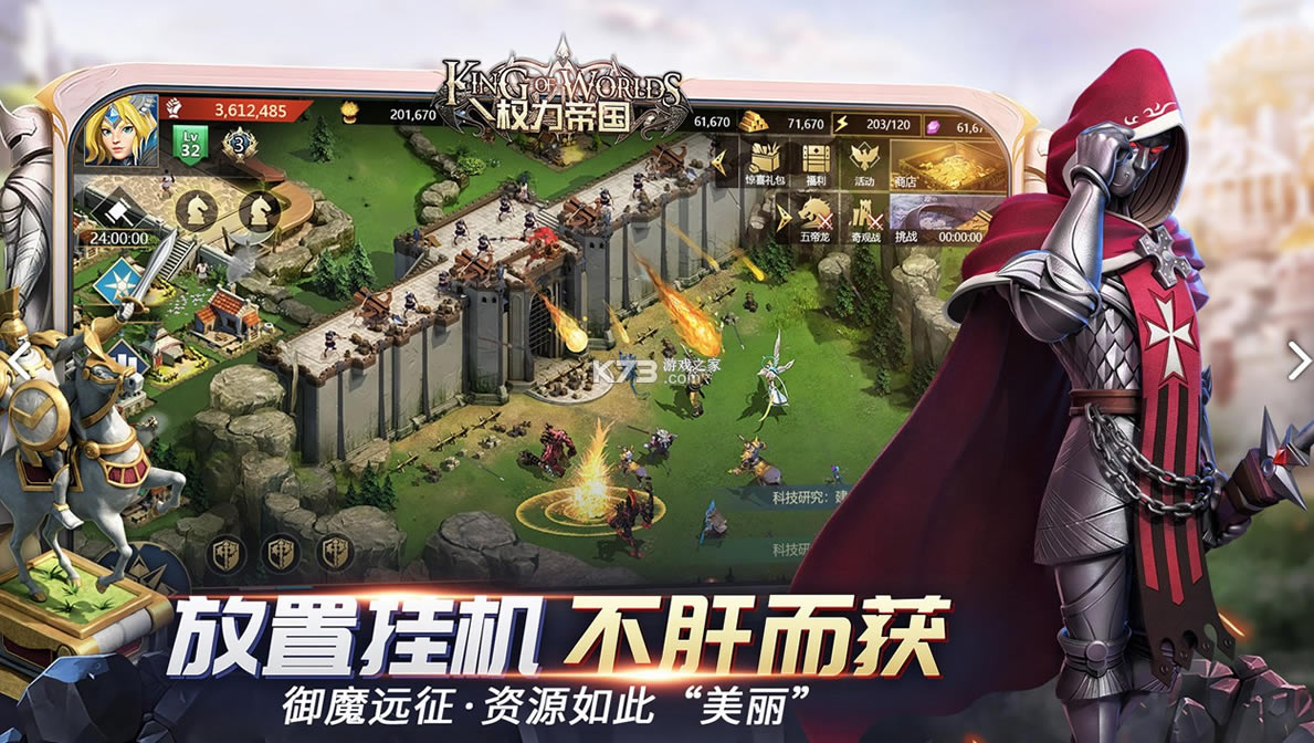 《权力帝国(King of Worlds)》是一款快节奏的世界级文明策略SLG手游,区别于传统慢节奏SLG,在这里您将化身一方领主,体验飞速升级、顺畅发育的城镇模拟经营乐趣,新颖放置挂机玩法的加入,助力资源不肝而获。即刻寻访全球著名英雄,亲手培育打造王牌军团,在这没有疆域界限的自由沙盘世界中,与来自不同国度的玩家同服竞技,战场之上策略攻防、纵横捭阖。在胜与败中缔造江山帝国,踏上世界之巅,见证属于你的荣光!