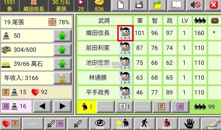 《日本战国织田信长传2》在这里开设自己的领地,强化军队,提升资源,不断的提升,来展开霸业之旅,这是日本的出色游戏之一,掌握好规则即可来畅玩,消灭其他战队。