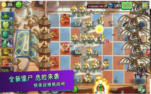 3、灵活的运用策略,合理的放置植物炮塔,快速的消灭各种不同的僵尸。