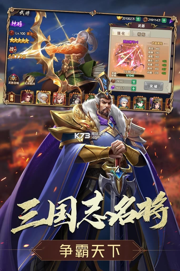 用精美的美术刻画出了武将生动的造型与动作,特色技能策略百变,周瑜配诸葛,关羽配曹操,打造心目中完美的英雄阵容。