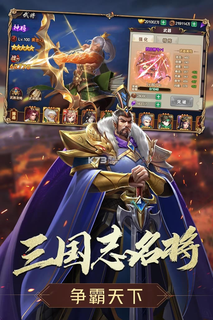 用精美的美术刻画出了武将生动的造型与动作,特色技能策略百变,周瑜配诸葛,关羽配曹操,打造心目中完美的英雄阵容。