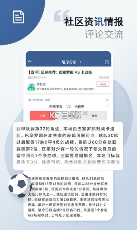 2.赛球探APP是一款集足球即时比分,赛事数据直播,专家分析与球友社区于一体的应用软件。