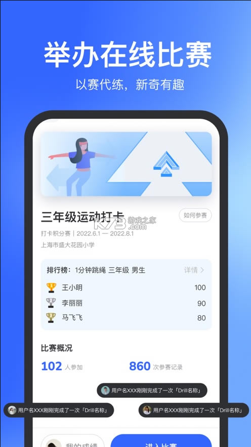 以赛代练,获得更好体育成绩;新奇有趣,智能互动新体验;方便快捷,随时随地都能比!
