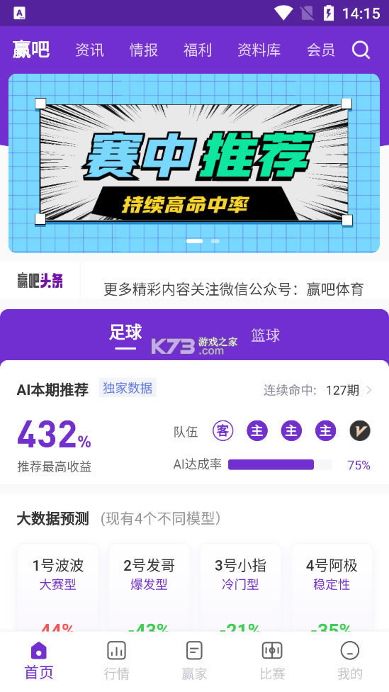 赢吧体育app是针对足球爱好者推出的一款手机应用。赢吧体育涵盖各类足球赛事,拥有自主足球赛事数据分析及预测技术,赢吧体育app致力于使用先进的数据挖掘和深度算法学习技术,为广大用户提供实时数据服务、历史交锋、球队资料、赛事分析等综合性体育数据服务。