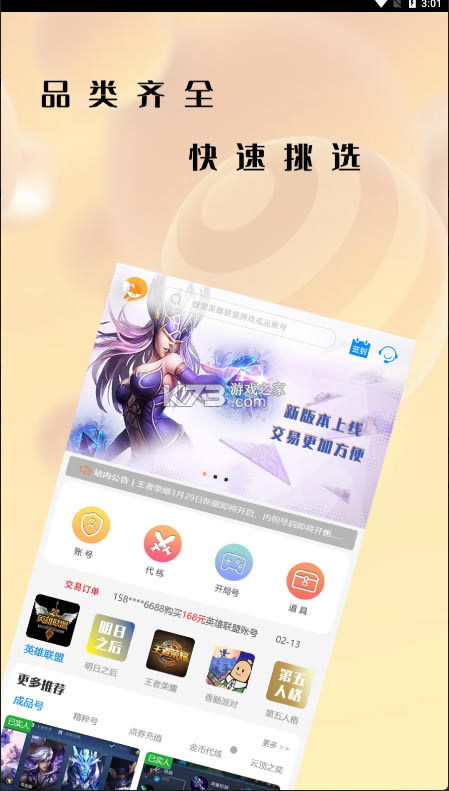 1、正规的交易平台,让用户可以放心挑选购买自己喜欢的账号,划分了多个不同的种类