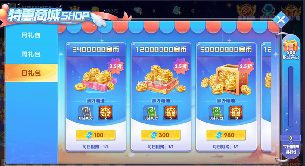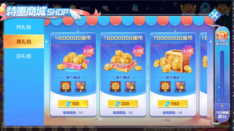 特惠商城首次可领1w金币,后续需要点券来兑换,每月只能兑换一次,周礼包首次5千金币免费领后续需要100点券来兑换2.5折扣每周1次兑换还送锁定和狂暴道具,日礼包3w金币免费领后续需要1百点券,还额外赠送道具。