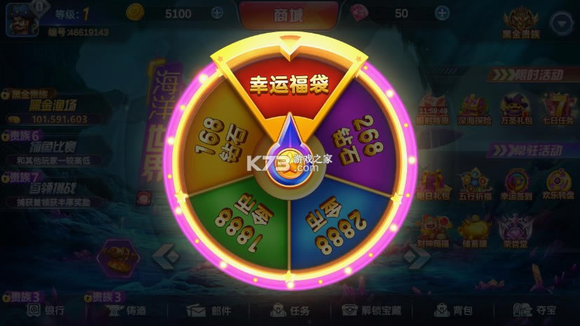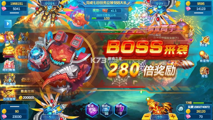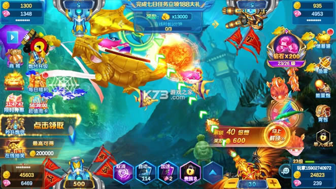 《集结号捕鱼》是游戏的特别礼包版本,这个礼包想要获得非常容易,只需要完成游戏的七日任务,你即可获得价值188元的豪华大礼包,丰富的奖励内容绝对会让你能够享受到尊荣的游戏乐趣。经典捕鱼中的领路王者,影视级画质,顶尖的美术团队,强大的技术团队倾情力作,给你一场不一样的豪华捕鱼盛宴!在这里你能体验到前所未有的视觉冲击,多鱼种,多BOSS,爆率高,倍数大,好看,好玩,更过瘾!《集结号捕鱼》是游戏的赠送金币钻石版本,在游戏的不同阶段,你在完成特定的任务、达到指定的等级等条件下,可以获得官方免费赠送的钻石,帮助你升级强化炮台,同时还可以不间断免费抽取金币奖励。《集结号捕鱼》中玩家可以通过使用自动射击卡和子弹加速卡,来让你更加轻松愉悦的游玩,不仅不需要重复的点击瞄准,一键锁定鱼儿,同时还告别了枯燥的点击,直接享受射击完成的结果。《集结号捕鱼》是游戏的送鱼雷版本,在游戏中当你达到一定的等级,官方会赠送给你免费的黑金鱼雷,这种鱼雷的威力非常强大,可以让你拥有强大的攻击力,在碰到奖励丰厚的强大鱼王和黄金鱼类时,可以发挥出极强的作用,将其一举捕获。《集结号捕鱼》是游戏的抽奖版本,这个版本可以在游戏中开启幸运轮盘,除了基础的在线奖励轮盘以外,你还可以在游戏中通过捕鱼激活特别的幸运轮盘,这种轮盘的奖励更加丰厚,可以获得的奖励也是前所未有的。