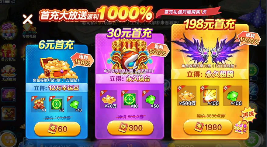 首充礼包:6元即可领12万幸运币返利150%,30元首充即可领永久炮台返利600%,198首充领取永久翅膀送6元首充奖励和30元首充奖励返利1000%,首充礼包只能购买一次。