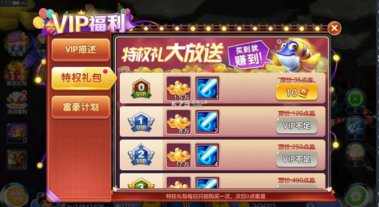 《全民街机捕鱼》登录就能够领取启航的礼包,欢迎来到海底的世界来快速的探索,开启全新的经典模式,多样的玩法,首充有礼包,还有专属礼包大放送,vip1元即可升级,完成任务领取更多的幸运币。