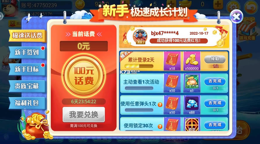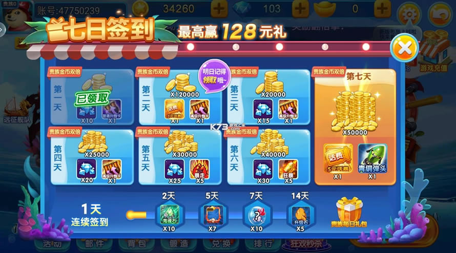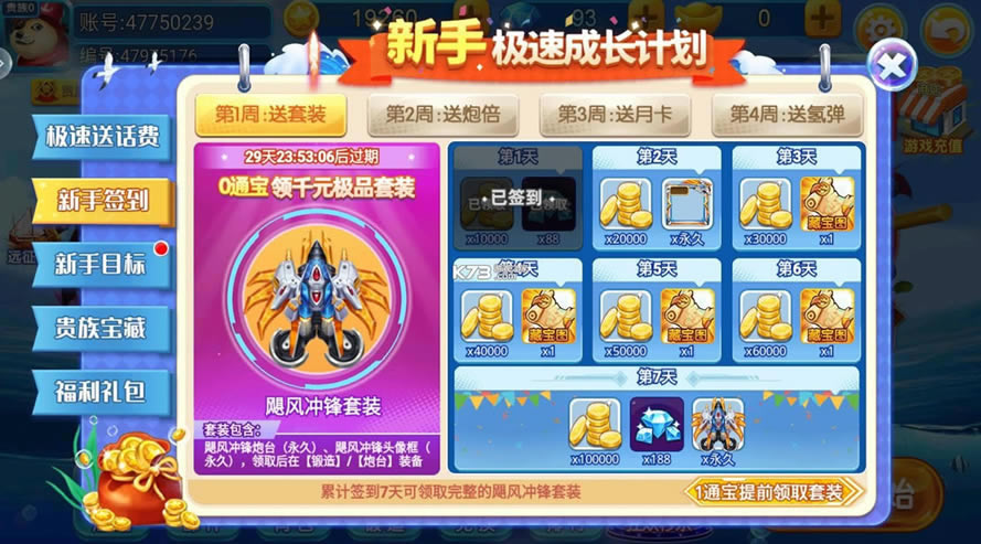 支持领取武器道具,开局加入新手局完成任务即可领取冰冻、锁定,七日签到可以领取普通升炮卡、高级升炮卡。游戏免费礼包兑换码:203828,(兑换方式:游戏-大厅-左侧免费金币-礼品卡兑换)。