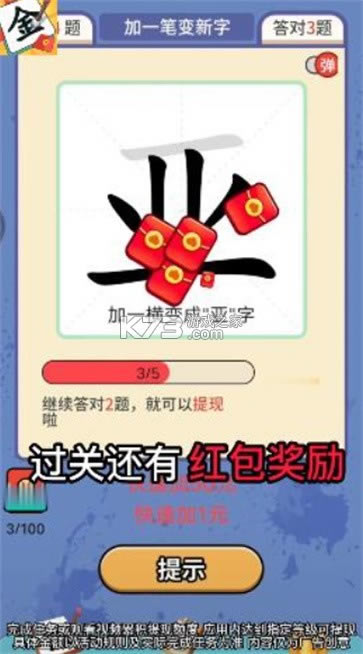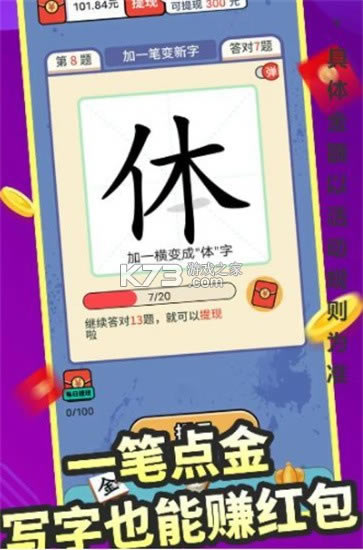 一笔点金是一款汉字类型的益智闯关手游,在游戏里有不同的汉字再等着你去挑战,只需将这些汉字加一笔就能变成另一个汉字,非常考验玩家的动脑能力以及对汉字字形的构造了解多少,成功的完成游戏任务就可以获得游戏奖励还有红包奖励,给玩家带来了非常多的欢乐。
