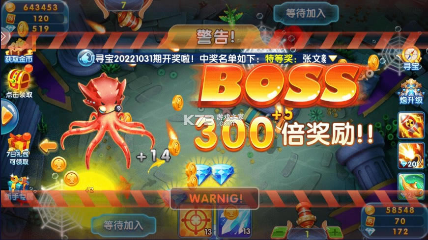 神秘奖励大三元,无上限大奖送不停:在捕鱼中更会有神秘场景,可领取无限大礼。