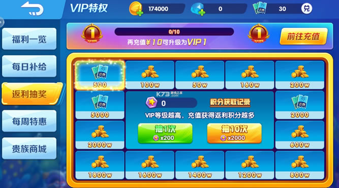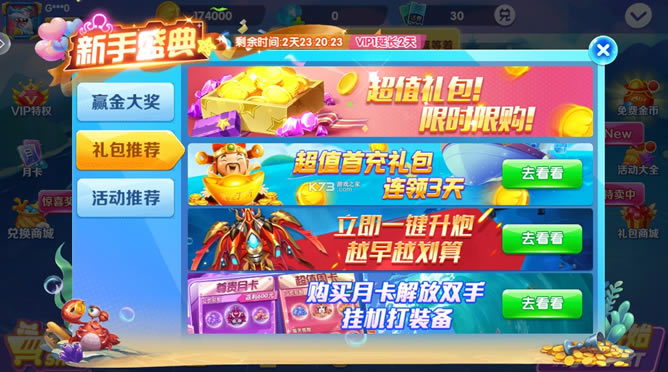 财神捕鱼这里的福利非常多,上线就送金币,每天还会有登录奖励,新人还有专门的礼包,完成任务就会抽奖送,你可以邀请好友自由送,当然节假日也会有活动奖励。这里有经典房、万炮房等等,让你开心捕鱼。