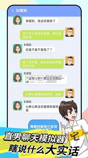 直男模拟器是一个有趣的仿真聊天类游戏,在虚拟世界里玩家会变成一个男的,和自己心目中的女人进行交流,各种搞笑的段子层出不穷,让人忍不住想要发泄心中的怒火,精彩的剧情层出不穷。