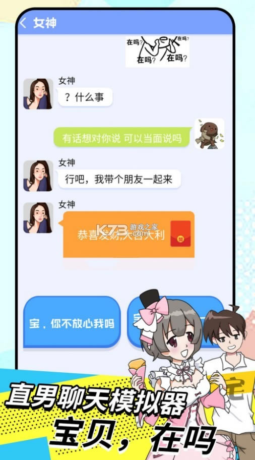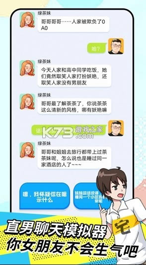 玩家将通过游戏模拟和女神聊天,学习运用各种话术攻略女神芳心,随时鉴别直男。