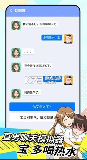 直男模拟器游戏是一款能够给玩家带来精彩聊天互动的休闲小游戏,拥有着多种剧情互动玩法可以在这个游戏当中带给大家,让你能够感受精彩的互动,多种多样的互动玩法可以在这个虚拟世界里给玩家带来,让你能够领略直男聊天的乐趣,带来欢乐的游戏时光。